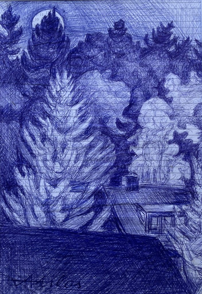 Mond über dem Wald, Kugelschreiber auf Papier, 23×16 cm